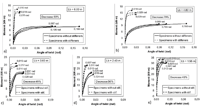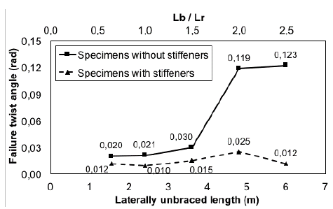 On the other hand, the values for the failure twist angle of the specimens with longitudinal stiffeners were lower relative to the specimens without stiffeners for all laterally unbraced lengths. These values were kept in an interval narrow from 0.010 up to 0.025 rad.