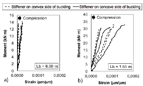 The longitudinal stiffeners used in the specimens within the elastic buckling zone (from 2.4 to 6.00 m) presented a similar behavior and their values of strain were lower than 0.00004 as shown in Fig. 17a, which corresponds particularly to the specimen with a laterally unbraced length of 6.00 m. Whereas for the laterally unbraced length of 1.55 m, which belong to the inelastic buckling zone, the strain reached values up to 0.00016 as shown in Fig. 17b.