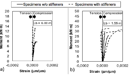 Nonetheless, the strain in the web of the specimens with stiffeners for a laterally unbraced length of 1.55 m (inelastic buckling zone) was slight higher with respect to specimens without stiffeners. This increase continues within the elastic limit of the material reaching a value up to 0.0002 as shown in Fig. 18b. Hence, the use of longitudinal stiffeners did not affect the behavior of the web of the tested specimens in this study.