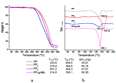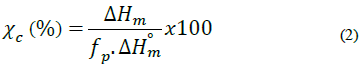 Where f p is mass fraction of the PP in the composites, ΔH m is the melting enthalpy of the sample and ΔH° m is the melting enthalpy of a 100% crystalline isotactic standard of PP (207 J/ g) [29]. In this work, the melting enthalpy (ΔH m) was estimated from the area (A) and the heating rate (dT/dt) eq. (3):