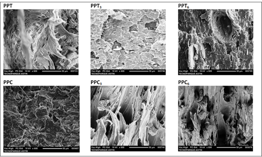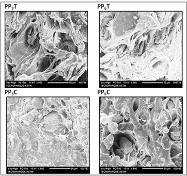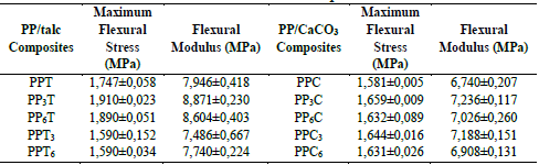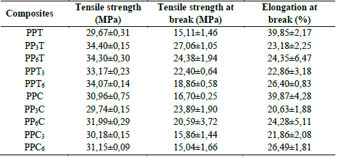 The above results allow to establish comparisons between the mechanical properties of the composites developed in the present work; these values are presented in Table 6. The addition of mineral charges such as talc and CaCO3 in the matrix leads to improvements in tensile strength, as they promote rigidity. However, the plastic zone of these materials exhibits an adverse effect on ductility because they drastically decrease the elongation response, although it considers higher bursting stresses. In PPT and PPC, the elongation in the traction test was maintained with respect to PP, which can be attributed to the formation of fillers charge aggregates that are constituted by particles that remain attached with forces higher than those presented by the agglomerates. The aggregates are easily separated from the matrix and tend to reduce the strength of the composite material while increasing its elongation. In contrast to the compounds of CaCO3, a better elasticity/ plasticity ratio is found in the composites with matrices that have a higher number of process cycles longer shear rates there by infers that fillers achieve greater dispersion.