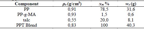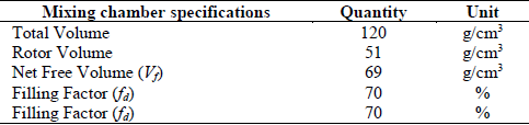 To determine the reological behavior of the mixtures in the torque rheometer, the mass of the components in the mixtures (PPT and PPC) was calculated. The net free volume of the chamber corresponds to the difference between the total volume and the volume occupied by the rotors. In addition, the value for the filling factor (70%) was kept constant; the values are presented in Table 1.