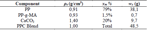 The density for each mixture (PPT and PPC) corresponds to the addition of the individual densities by the fraction of the components, according to the rule of mixtures; these results are presented in Table 2 and 3. In addition, the result of the mass determined from equation 1, Section 2.3.1.