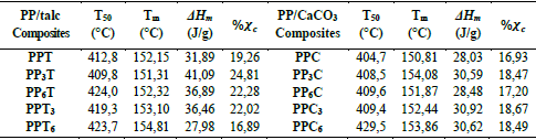 The degradation and melting temperatures for the talc and CaCO3 composites presented in Table 4 show the positive influence of the filler on the different generations. The significant differences according to the type of conformation of the material with which it is evidenced that the reprocessing of the composite material encourages the interaction of the material incorporated in the matrix probably by the increase of the surface area that is achieved with the decrease of particle size. In general, the curves obtained in TGA for the compounds show a similar slope from which a gradual relationship between the T10, T50 and Tcut off values are obtained. The melting temperatures were maintained at values close to 152 °C, and the degree of crystallinity of the compounds was between 17% minimum for PPT6 and 24% maximum for PP3T. The fillers used did not promote the change between the crystalline phases of the PPn.