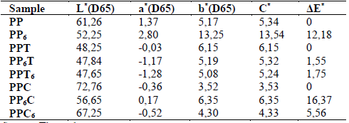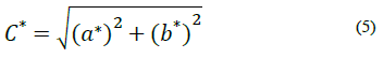 The samples were analyzed with a Minolta CR-400 colorimeter (D65, 2°, Y = 89.5, x = 0.3176, y = 0.3434) in order to know the surface color. Data were collected in the CIELab and values of L* (brightness), a* (ranging from red to green) and b* (ranging from yellow to blue) were recorded during each triplicate test. The color (C*) was calculated as follows eq. (5):