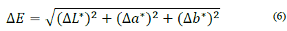 While the color deviation was calculated using the following equation (6) (ISO 11664-4: 2008/CIE S 014-4/E: 2007) [30]:
