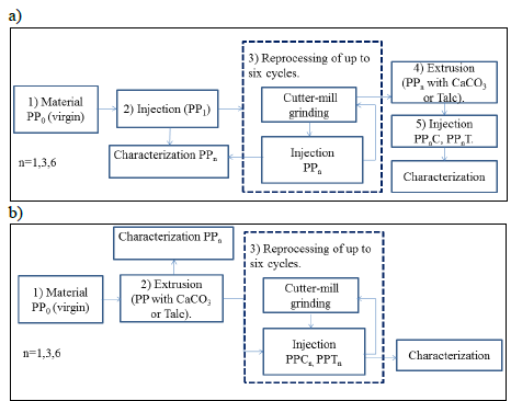 The samples were labelled as follows: PPnMn, where PP indicates the matrix of polypropylene used and M the mineral charge incorporated (C: calcium carbonate, or T: talc), n subscript corresponds to the number of reprocessing cycle. For example, PP3C is a polypropylene composite obtained in the third reprocessing (PP3) and mixed with calcium carbonate (step 3, Fig. 1); PPC3 is a composite of virgin PP mixed with calcium carbonate that has been reprocessed thrice, three folds, three times (step 3b, Fig. 1). To all the compounds were added 1.5% by weight of PP-g-MA.