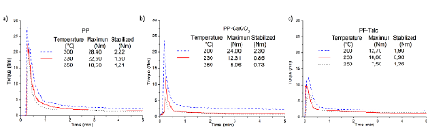 Once the components of the composite were added to the mixing chamber of the torque rheometer, it was operated at a rotor speed of 45 rpm and temperatures of 200 °C, 230 °C and 250 °C for 5 minutes. The behavior of the blends during the processing are shown in Fig. 2.
