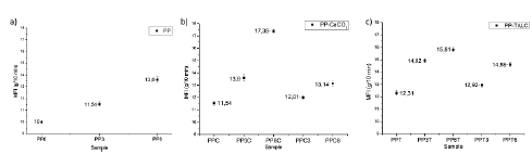 Figure 3: Results of flow index of the generations of a) PP, b) PP- CaCO3 and c) PP-Talc.