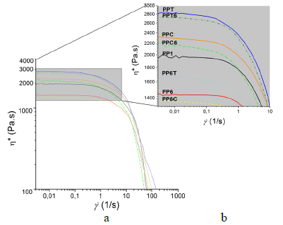 The typical shear behavior for the complex viscosity observed in PP resins and their compounds is showed in Fig. 4 (a). Compositions of up to 20% by weight of the added fillers tend to produce increase in viscosity; talc content fillers show significant viscosity increases attributed to moistening of the filler (polymer/charge interaction). In general, the compounds showed a significant and similar drop in viscosity at high frequencies (100-1000 s-1). So, they do not represent a problem for their processing. An important aspect to be observed from Fig. 4 (b) on an enlarged scale is that the compounds become more dependent on shear rate in the low frequency range because of the type of filler and the thermal history of the matrix. This shear thinning behavior can be attributed to a higher degree of polymer-filler interaction, which requires higher shear stresses and longer relaxation times for the composite to flow.