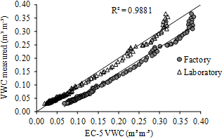 According to the F-test in analysis of variance (ANOVA), measured VWC and EC-5 estimated VWC, as calibrated by the manufacturer, were significant as shown Table 1.