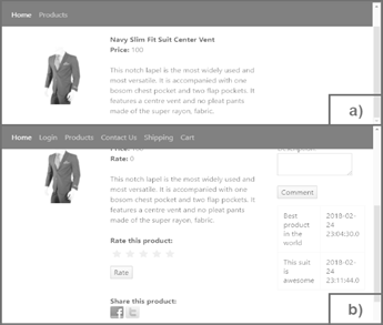 The results show that only three lines of code were manually modified (in the database management configuration file to specify the database URL, name and password) to complete each product derivation. Fig. 9 shows the P1 and P5 products running over a web browser; Fig. 9.a shows the P1 “product section” which contains a very basic configuration where the final user is able to read the product information; and Fig. 9.b shows the P5 “product section” which contains a complete configuration where the final user is able to rate, share, comment and add the product to the cart.