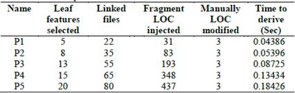 At the end of this implementation we derived five products. The results of our preliminary evaluation are summarized in Table 1 with the: (i) name of the product, (ii) quantity of the selected leaf features, (iii) linked files between the selected features and the corresponding component files, (iv) fragment lines of code automatically injected, (v) lines of code manually modified to finalize the product derivation, and (vi) time in seconds required to carry out the product derivation.