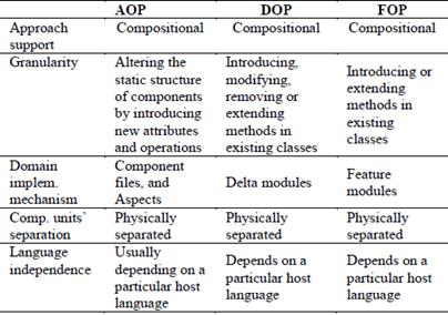 FOP, DOP, AOP and annotative approaches have been developed to design and implement domain components. FOP allows developing software assets in terms of feature modules [6], which can be seen as increments of product functionality. For example, in the context of OOP, a feature module can introduce new classes or refine existing ones by adding fields and methods, or by overriding existing methods. DOP allows the assets to be defined in terms of delta modules, which can also be seen as increments of product functionality. DOP is an extension of FOP, which is also a compositional approach. Delta modules generalize feature modules by allowing the removal of functionality [7]. AOP allows the assets to be defined in terms of aspects. An aspect encapsulates a cross-cutting feature into a modular unit. AOP has been used to implement SPLs by the composition of aspects, through mechanisms such as pointcut and advice [9] with the aim of making crosscutting features more modular and evolutionary. Annotative approaches allow the developers to add “annotations” to the assets at arbitrary levels of granularity. In annotative approaches, developers simply introduce markers at the exact positions where an asset should be extended [11].