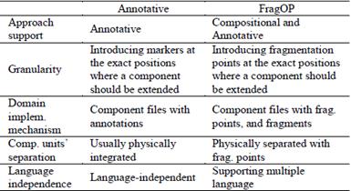 Tables 2 and 3 summarize the comparison of the previous approaches and FragOP based on five different perspectives: Approach support refers to the approach classification. Granularity is closely related to the approach expressiveness. Very coarse-grained approaches only assemble files in a directory, while fine-grained approaches allow modifications on the level of methods, statements, parameters or even expressions. Annotative approaches are more fine-grained than compositional ones. Domain implementation mechanism refers to the way in which each approach realizes the domain implementation. Component units’ separation refers to the way in which components are developed. Compositional approaches implement components as distinct (physically separated) code units. Annotative approaches commonly use #ifdef and #endif statements to surround the component code; but including the code variants and relationship inside the domain components code. FragOP introduces fragmentation points in the components code, but uses separated fragments that contain the code to be injected. Language independence refers to the applicability of each approach to be used independently from the language. Annotative approaches are line-based or character-based, and therefore language-independent. Compositional approaches are usually dependent on a particular host language. As shown, FragOP could be used for implementing domain components that contain multiple languages.