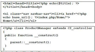 Components are made up of files that represent, for instance, HTML, CSS, JavaScript, Java, and JSP files. Listing 1 shows an example of: (i) header.php file which is written in HTML and PHP and represents the header of an application. This code contains a menu, which corresponds to an unordered list with only one element (i.e., “Home”) that is linked to the home section of the application. (ii) The ProductManager.php file which is written in PHP and represents a controller to manage the product information. In this case, it only contains a construct function.