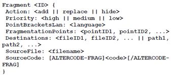 A fragment is a special type of file which allows developers to specify code alterations to the components files. It is worth to note that these alterations are designed only to be carried out at the application level when components are being integrated to derive new products (described in Section 4.2), which guarantees the reusability of the domain components. In general, a fragment respects the shape presented in Listing 5 and explained thereafter.