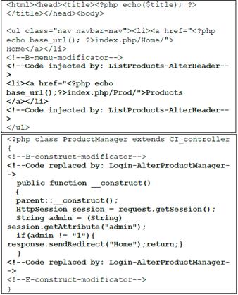 For a better understanding about how fragments work, let us consider the following example. Listing 6 shows (i) the alterHeader.frag code which specifies that the BasicViewsHtml-Header file (Destinations) will be altered in the menu-modificator (FragmentationPoints) with a high priority. In this case, the fragment will add (Action) a new menu element (SourceCode) inside the file. And (ii) the alterProductManager.frag code specifies that the ProductManager-Controller file (Destinations) will be altered in the construct-modificator (FragmentationPoints) with a high priority. In this case, the fragment will replace (Action) the ProductManager construct function with a new construct function (SourceCode).