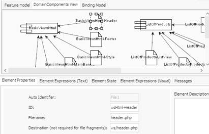 For the second activity, PL engineers should create a domain component model. This model provides an abstract view about how domain components are organized. The abstract view of each domain component can be operationalized with implementation files written in languages such as PHP, HTML and CSS as we did with the domain components of the ClothingStores PL. Fig. 3 shows an excerpt of the ClothingStores domain component model and its operationalization. Thus, the domain component model represents: (i) the domain components, (ii) their operationalization files, and (iii) information about the files (their identifiers, filenames and destinations in which will be derived).