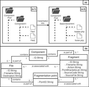 In this activity, PL developers must create a domain component pool directory to store the corresponding files. The domain-independent structure presented in Fig. 4a.1 can be used as a template to create the domain-dependent folder structure (e.g., for a PL of Web applications), as presented in Fig. 4a.2. Fig. 4b shows the FragOP meta-model, which describes how domain component files and fragments are made up in detail, and how they are related to each other. The rest of this sub-section presents these concepts and shows how to implement each concept.