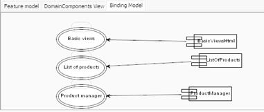 The last domain engineering activity consists on developing a binding model between the requirements model and the implementation model. Fig. 5 shows a binding model between the FM and the domain component model. In this example, features are directly linked to components that operationalize them in a one-to-one relationship. This relationship goes from each domain component to the domain requirement (feature) it implements. To enhance this simple binding relationship, we plan to implement a constraints network [20] to graphically represent more complex domain implementation relationships such as “Domain components C1 or C2, but not both, can be used to implement feature F”.