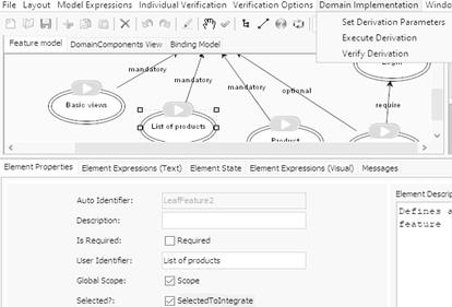 To fully support the FragOP process we enhanced VariaMos [17]. VariaMos has been used in several SPL projects and approaches during recent years; this tool incorporates a language to represent and simulate families of systems and (self) adaptive systems [18]. We took advantage of some VariaMos capabilities such as: product line requirements modelling and product simulation; and we improved VariaMos with new capabilities to support the FragOP process: (1) domain components modelling, (2) the bind (or weave) the product line requirements model and the domain component model, (3) configure new products from the domain models, (4) derive the configured products, and (5) verify the domain models and the derived products. The activities of the FragOP process are explained and exemplified, within a simplified ClothingStores PL, in the next two sections.