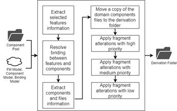 The “Execute Derivation” option allows deriving the software products based on an automated algorithm that follows a series of instructions as presented in Fig. 7. At the beginning, VariaMos takes the information from the component folder and the developed models. Then, based on these models, it resolves the binding relationships of the selected features to have the corresponding components and files. Following, VariaMos creates a copy of the components’ files (from the domain component pool) and moves the copied files to the derivation folder. At the end, it applies the fragments’ alterations over the copied components’ files by priority order. The output is a derivation folder, which contains the integrated components and the final software product. The derivation algorithm also provides different alerts such as: invalid fragment definition, missing fields, invalid fragmentation point definition, invalid actions and invalid filenames and paths.