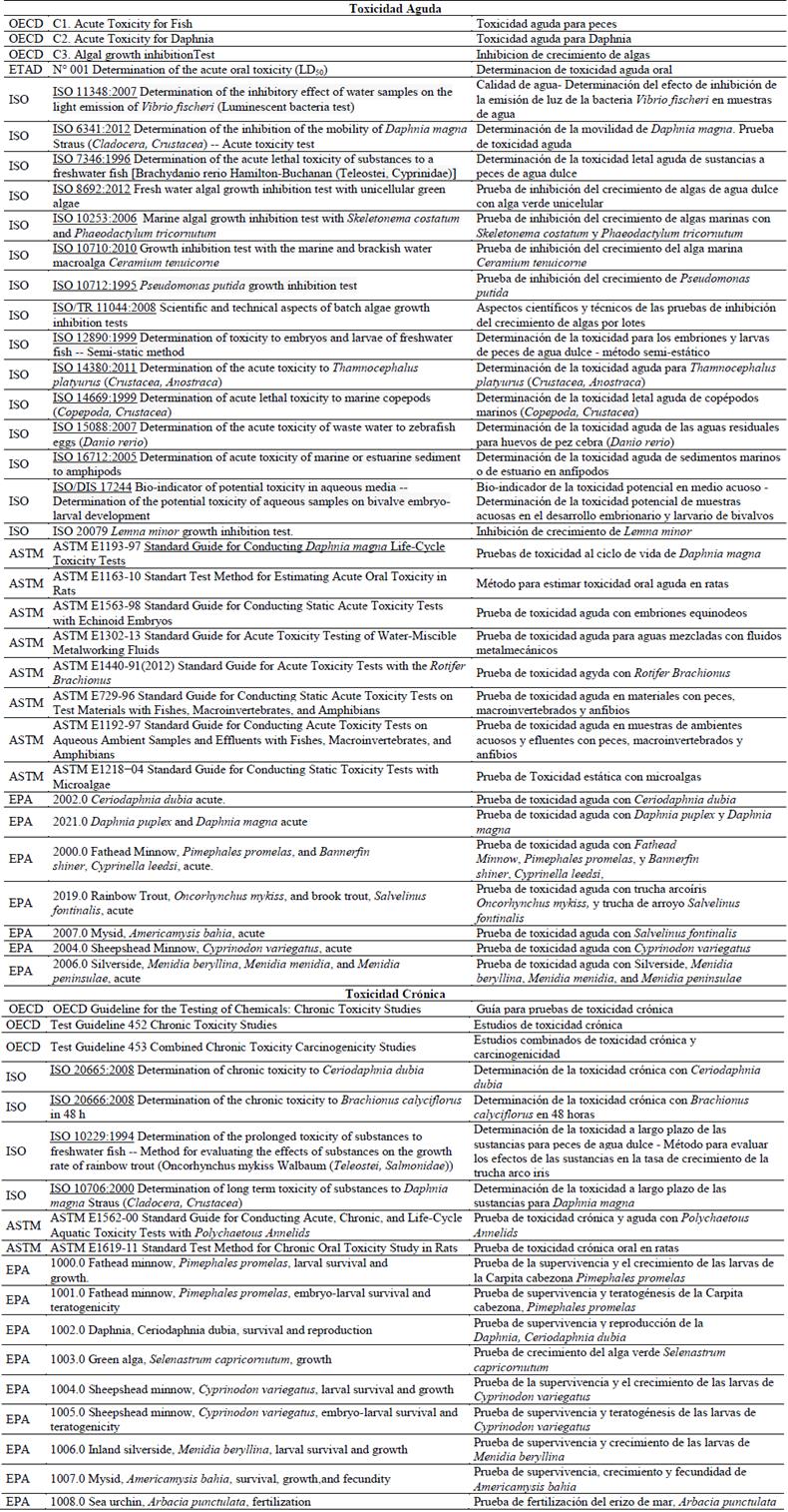 Tabla 1: Protocolos estándar de pruebas de toxicidad aguda y crónica
