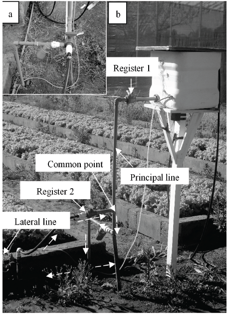For proper operation of the irrigation system, it was first necessary to connect it under higher pressure until the expulsion of air present in the tubing (for approximately 1 minute) through of the register 2 and then the inlet pressure of the system was change to 14.72 kPa (register 1). Every time it was necessary to connect the irrigation system this was repeated (Fig. 3).