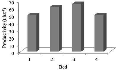 The average weight of harvested lettuce was 512.6 g, which corresponds to a productivity of 57.0 t ha-1. At the beds of numbers 1 and 4 similar productivity were obtained but their values were below beds 2 and 3 which had a productivity of 61.5 and 65.7 t ha-1, respectively (Fig. 4).