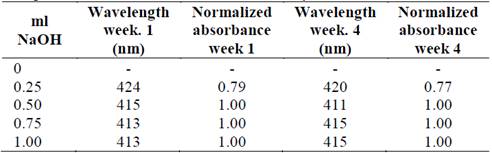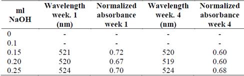 Table 4: Comparison between wavelengths and absorbance weeks 1 and 4 for gold nanoparticles at different volumes of sodium hydroxide.