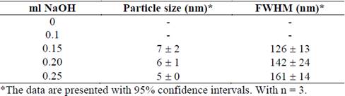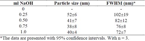 Table 5: The experimental particle size and FWHM of silver nanoparticles at different volumes of sodium hydroxide.