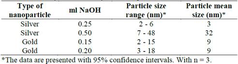 From the above equations and as of the addition of 0.25 ml and 0.15 ml of sodium hydroxide for silver and gold respectively [8], it is possible to obtain nanoparticles (see Figs. 5 and 6). Therefore, the presence of sodium hydroxide besides favoring the formation of silver and gold nanoparticles, at the same time increases the pH values, which significantly decreases the efficiency and formation rate of the nanostructures [31]. This behavior can be observed in the absorption spectra of Fig. 3 and 4, where with volumes of sodium hydroxide of 0.5 ml for silver and 0.15 ml for gold, there is no significant variation in the absorbance values (see Tables 1 and 2).