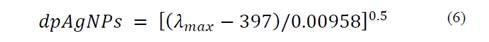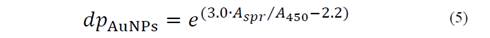 Where A spr and 𝐴 450 correspond to the absorbance obtained at the wavelength of the superficial plasmon resonance and at a wavelength of 450 nm respectively. While 𝜆 𝑚𝑎𝑥 is the wavelength of the superficial plasmon resonance. The above equations are valid for a range between [5-80nm] and [20-100nm], respectively.