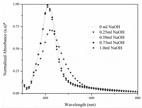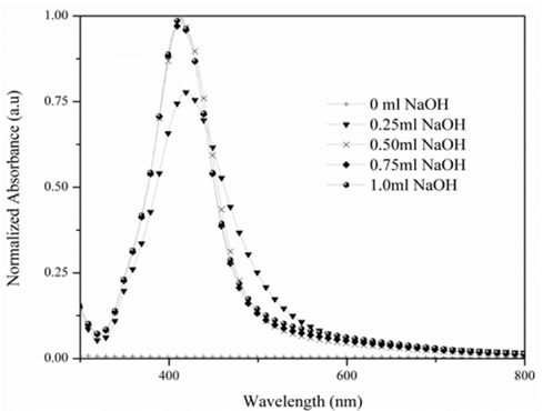 Figure 3: UV-visible spectra of silver nanoparticles at different volumes of sodium hydroxide. As control samples, solutions without reducing agent was used.