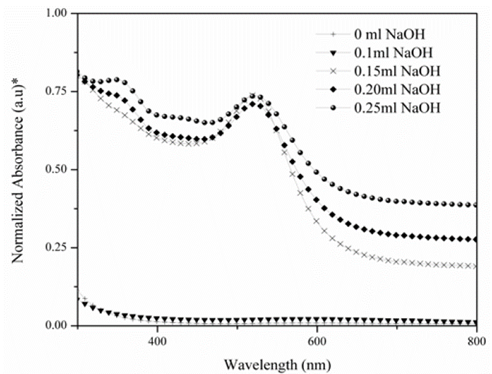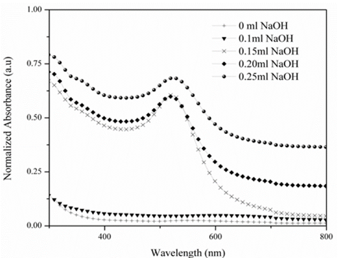 Figure 5: Gold nanoparticles at different volumes of sodium hydroxide.