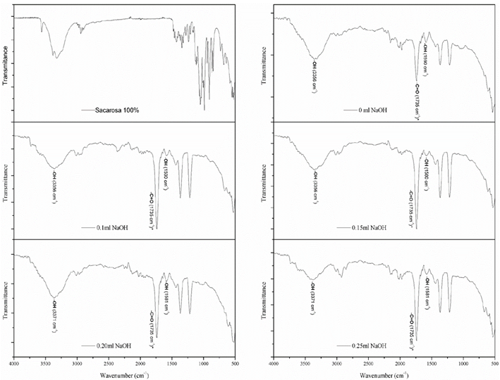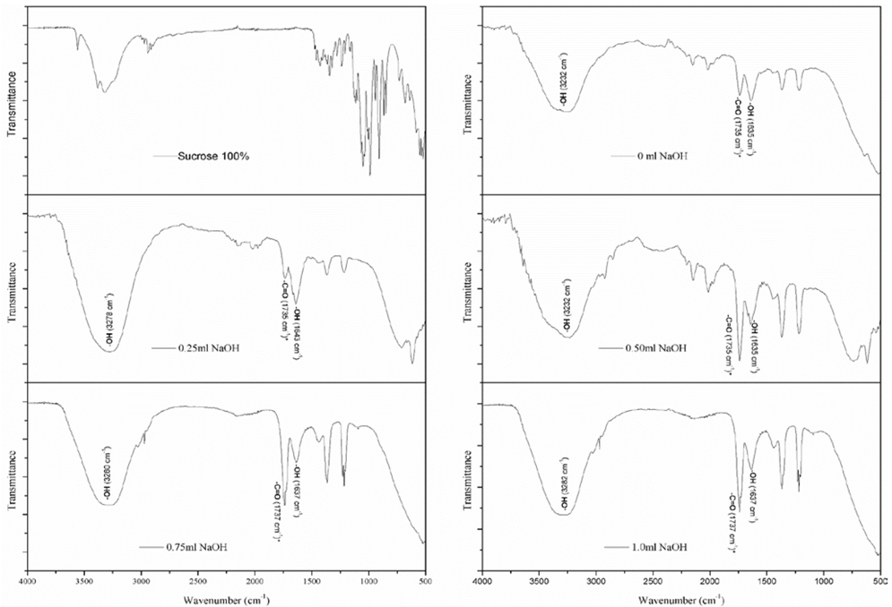 The FTIR spectra of silver nanoparticles exhibit characteristic bands at 3283 and 1637 cm-1, which may be associated with hydroxyl groups either from sucrose, glucose, fructose or gluconic acid [31,37], while the presence of a band at 1738 cm-1 is linked to the stretching of the carbonyl group of the glucose or the gluconic acid. Increasing the volume of sodium hydroxide leads to the appearance and increase of the intensity of the band related to the stretching of the carbonyl group, generated by the breakdown of the glycosidic bond or the oxidation of glucose to gluconic acid.