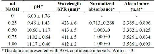 From Fig. 3 and 4, it is possible to demonstrate that sucrose in presence of different volumes of sodium hydroxide promotes the formation of gold and silver nanoparticles, from hydrolysis and reduction-oxidation reactions, combined with the presence of the absorbance peaks for each kind of metal between the characteristic wavelength ranges.