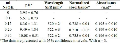A 0.5mM chloroauric acid (HAuCl4) was prepared and mixed with 0.1M sucrose solution. Then, 0.1M NaOH was added at volumes of 0 ml, 0.1 ml, 0.15 ml, 0.20 ml and 0.25 ml. Next, the solutions were carried in a water bath at 60 °C by 30 minutes. Once the samples reached standard conditions for temperature and pressure, the pH was read using an Ohaus Starter 2100 pH bench meter. In addition, blank solutions from the mixture of reducing agent and the different volumes of sodium hydroxide employed in the reaction were prepared. All assays were performed in triplicate.
