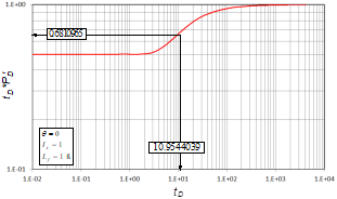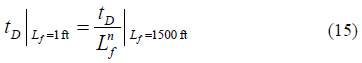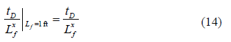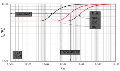 Fig. 1 presents the pressure derivative behavior for three different well-to-fault distances in isotropic systems. A unique behavior for the three systems is required to obtain the characteristic points that will be used to develop the interpretation equations. Notice in Fig. 1 that the dimensionless time at which the fault is felt increases as the well-fault distance increases; then, for the behavior unification, the dimensionless time is divided by the distance, L f n , where n is an unknown exponent that may affect the unified behavior. Although, not shown here, when n = 1, no unified behavior is obtained; then, n must be different than one and ought to be determined. A simple procedure to find n is based on the use of the pressure derivative curve with L f = 1 ft.; in such a case, n has no impact on the pressure derivative curve, since a division by the unity does not cause any alteration on the result (see Fig. 5). To find the value of n, an arbitrary point is chosen during the time between the two plateaus seen on the pressure derivative, which is the matching zone of interest on the curve L f = 1 ft. The arbitrary chosen reference point was the inflection point. An analogous point is taken from another curve with L f > 1. For this case, the arbitrary curve for L f = 1500 ft. was chosen. The reading points are then obtained from Figs. 2 and 6: