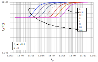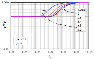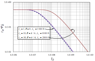 A similar treatment was first performed on Fig. 2 for the anisotropy index. As seen on that plot, the inflection point increases as the anisotropy index increases its effect in the denominator. An n value of 0.5 was found with a procedure similar to the one used for the well-to-fault distance case. In Fig. 3, the effect of the anisotropy angle, (; is presented. As ( increases, the inflection point shows up earlier, meaning that its effect goes in the numerator. The n exponent for this case is the unity, but the effect changes when ( ( (/2. Then, finally, the unified behavior is obtained when the dimensionless time is multiplied by a correction factor, ( FC , and divided by the product of the square root of the anisotropy index times the squared well-to-fault distance. The range of angles applied for ( FC is given in Eq.(19). This also works for the constant-pressure boundary case, as shown in Fig. 4. Fig. 6 presents a unified dimensionless pressure derivative behavior against ( FC t D /(I A 0.5 L f 2). In other words, universal dimensionless pressure derivative behavior is obtained. From that plot, the inflection time, t inf-once the fault has been felt-for all cases is given by the following: