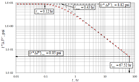 The TDS Technique, [25], is a powerful and practical interpretation technique that uses characteristic lines and features found on the pressure derivative plot. The solutions of the diffusivity equation for each individual flow regime are used to develop mathematical expressions to determine reservoir parameters. Maximum points, minimum points and inflection points are also used to develop equations for further reservoir characterization or parameter verification. Even though the intersection of the governing equations of two given flow regimes do not have any physical meaning, its use also allows further expressions to be developed to create more equations.