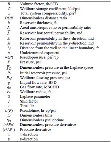 This work is also based on the works of [15] and [23]. A more general and practical formula was also developed using the time at which the radial flow regime ends. However, this new formula includes the effects of both anisotropy angle and anisotropy index. It was obtained by creating a unified behavior of pressure derivative against ( FC t D /(I A 0.5 L f 2), where ( FC is a correction factor involving the anisotropy angle and I A is the areal anisotropy index (k x /k y ). When the ending time of the radial flow regime is obscured by noise, the inflection point observed between the two pressure derivative plateaus is used in a similar equation. However, this inflection point is better determined using the maximum point on the second pressure derivative curve. For the case of a constant-pressure boundary, a negative unit slope line is developed. An equation for such a line was empirically (linear regression) obtained, so an arbitrary point read on such a line is used to find the distance from the well to the discontinuity. Also, the intersect of such a line with the extension of the radial flow regime line is used to develop another expression to find the distance to the constant-pressure boundary. Synthetic examples and a field case were used to successfully verify the developed equations. Care must be taken if an anisotropic reservoir is dealt with as an isotropic system, since the error could be as high as 100%.