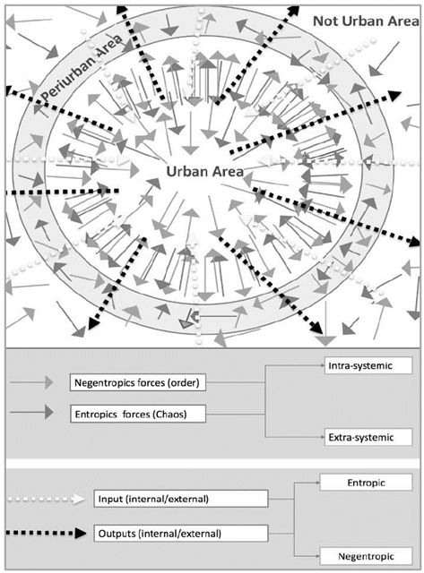 Consequently, the triad system-boundary-environment, or urban-periurban-not urban entails intentional and unintentional forces affecting the morphology of the system and its subsystems. That morphology of the system becomes an hybrid, which is a complex combination depending of the in situ performance of the entropy and negentropy struggle (Fig. 1).