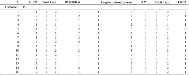 Table 3 presents the best individual obtained with the genetic algorithm for the collaborative approach, which produces the lowest replenishment costs. It must be noted that this individual is a vector of 150 genes, but for presentation purposes it is depicted as a table. This best individual for the collaborative approach can be easily decoded to the k i integer numbers corresponding to the multiples of the cycle time using the procedure established by [47]. Table 4 shows the results for the collaborative approach, in which k i values are expressed as integer numbers, as well as the cycle time, the total cost and the number of trips required for the replenishment plan.