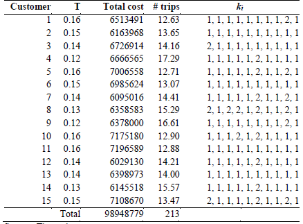 The distribution plans for every customer obtained with the individual approach are presented in Table 5. As expected, for every customer there is an assigned optimal cycle time T*, a total cost and a yearly number of trips. It must be considered that in each case the number of trips is multiplied by two, indicating at least one round trip between a single customer and the supplier. From this table it can be observed that the k i values for the products of customers 2, 6, 11 and 13 are equal to 1, indicating that all products must be jointly replenished every cycle time in order to reduce the logistics costs. For this individual approach, the highest k i value is 2 while in the collaborative approach it is 3, but only for one product. However, the k i assignment between the two approaches is very different, indicating significant changes in the distribution plans.