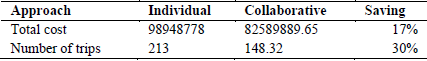 Table 6 shows the comparison for the collaborative and individual supply plans calculated using the genetic algorithm for the JRP model. From this table it is possible to observe that through collaboration the total costs and the number of trips are reduced. This is attractive for companies and city administrators since through the collaborative effort companies can lower their operating costs and also reduce a negative impact to the city, as the congestion caused by trucks circulating within the urban areas because the number of required trips is also reduced.