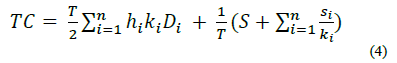 The order quantity for each product (Qi) in every cycle time is expressed in equation 1 and the total annual cost incurred for holding every product i can be calculated using equation 2. The ordering cost for each item is given by equation 3, which must be added to a fixed ordering cost S that is incurred every time a replenishment operation must be deployed with at least one product.