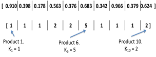 The individual is represented by the chromosome. In the case of the Joint Replenishment Problem, this representation can be done through a vector of integer numbers [35], real numbers [47] or binary numbers [34]. In this article, a real number representation is used following the work of [47], as depicted in Fig. 3 for a 10-product joint replenishment process. In the proposed individual representation, a gene located in the position i represents the k i value for the ith product. These real numbers are coded into the k i values by the procedure presented in [47]. Using real numbers coding facilitates determining the upper and lower limits for the k i values in order to make a more accurate search in the solution space, as proposed by [34] and [47].