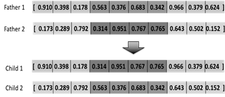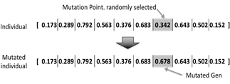 The crossover operation is done by using a two-point crossing method, as shown in Fig. 4. For this procedure the crossing points are selected randomly. The mutation operation is carried out using the one-point method as shown in Fig. 5. The mutation gene is randomly selected and its value is changed by a random number between the lowest and the highest real value of the entire chromosome that represents the k i .
